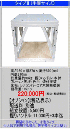 | ㉟地震シェルター タイプ2 <旧タイプ新品> 残2台あり! 注:握りハンドルは1個になります ※旧タイプと新タイプの違い 新タイプはタイプ1と同じ高さになり握りハンドルが標準で2個付きです。 大柄ではない方の2人用としては旧タイプがリーズナブルでお勧めですが、生産を終了したため最後の在庫こちらで売り切ったら終了になります。 200,000円税・配送費別 |