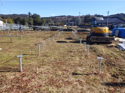 ![]() スクリュー杭打込み後、防草シート設置中 |